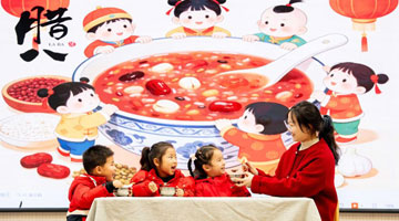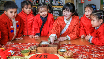 1月16日,在山东省青岛市李沧区夏庄路幼儿园,小朋友跟着老师学习缝制扎染马。