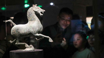 1月17日,在山东滕州博物馆文创商店,一名小朋友选购“踏马游春”文创摆件。