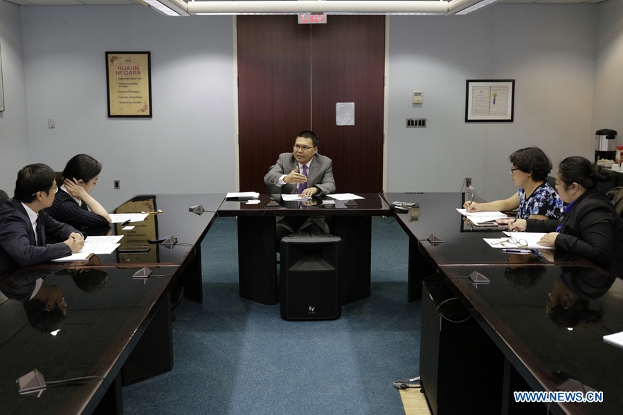 Dato' Muhammad Shahrul Ikram Yaakob (C), Malaysia's permanent representative to the United Nations, speaks during an interview with Chinese media in New York, the United States, May 11, 2017. (Xinhua/Li Muzi)