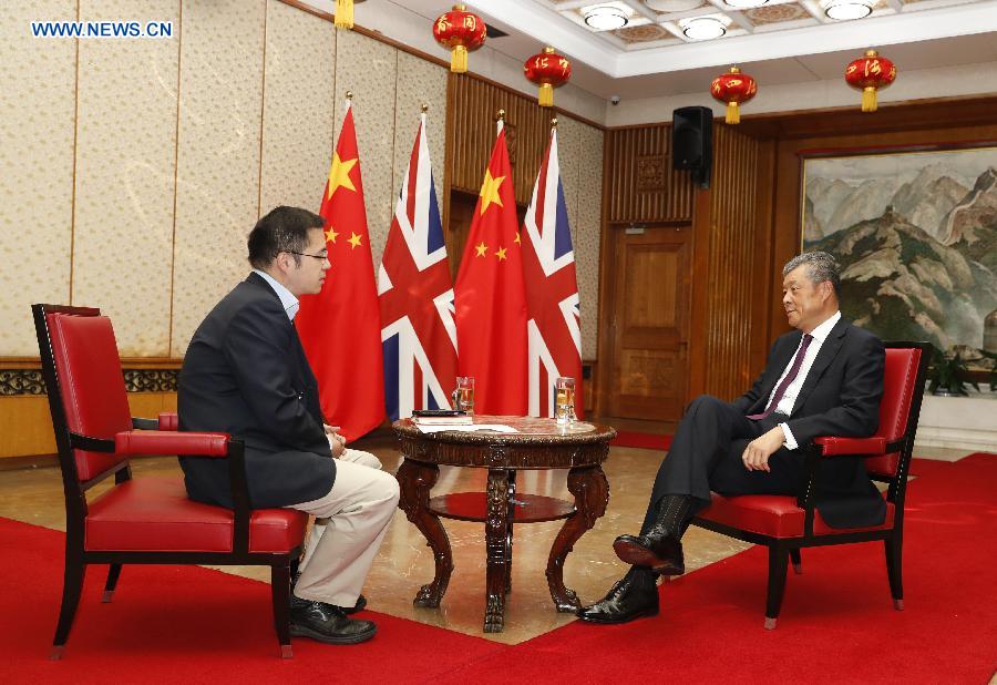 Chinese Ambassador to Britain Liu Xiaoming (R) receives an exclusive interview with Xinhua in London, Britain, May 12, 2017. Liu Xiaoming has said that China and Britain enjoy a mutually beneficial and advantage complement relationship in developing the Belt and Road Initiative, which has become a new highlight in the bilateral relations.(Xinhua/Han Yan)