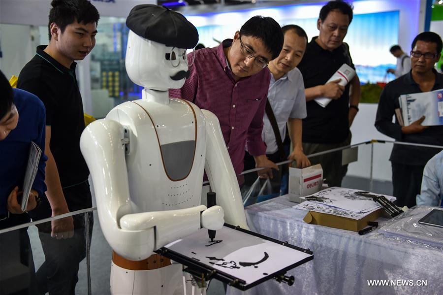 People watch a robot painting demonstration during the 19th China Hi-tech Fair in Shenzhen, south China's Guangdong Province, Nov. 16, 2017. Over 3,000 exhibitors participated in the hi-tech fair displaying a lot of robot and artificial intelligence projects. (Xinhua/Mao Siqian)