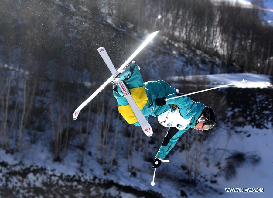 Dmitriy Reikherd of Kazakhstan competes during the men's Moguls on the Day 2 of the 2017-2018 Freestyle Skiing World Cup-Moguls & Aerials at the Thaiwoo ski resort in Chongli District of Zhangjiakou City, north China's Hebei Province, Dec. 22, 2017. Dmitriy Reikherd won the second place of the event with 84.92 points. (Xinhua/Wang Xiao)