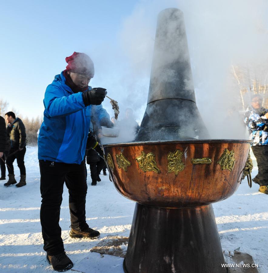 A tourist enjoys a hotpot at Mangui Township in Hulunbuir, north China's Inner Mongolia Autonomous Region, Dec. 22, 2017. The 2017 Greater Khingan Ice and Snow Festival closed here on Friday. (Xinhua/Li Renzi)