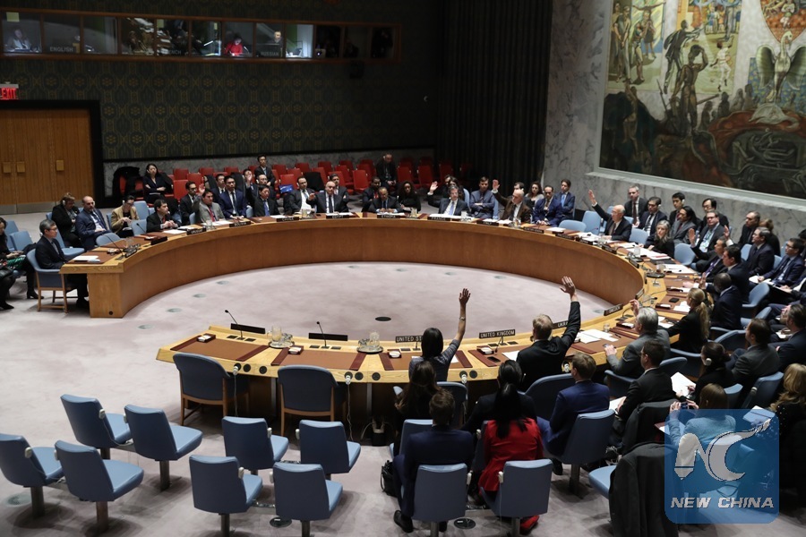 Photo taken on Dec. 22, 2017 shows the United Nations Security Council voting on a resolution on the Democratic People's Republic of Korea (DPRK) at the UNheadquarters in New York. The United Nations Security Council on Friday adopted a resolution to tighten sanctions against the DPRK. (Xinhua/Wang Ying)