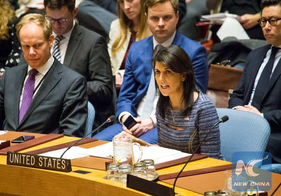 U.S. Permanent Representative to the United Nations Nikki Haley (R, Front) speaks after the United Nations Security Council adopted a resolution on the Democratic People's Republic of Korea (DPRK) at the UN headquarters in New York, on Dec. 22, 2017. The Security Council on Friday adopted a new resolution to further tighten sanctions against the DPRK in response to Pyongyang's ballistic missile launch on Nov. 28. (Xinhua/Wang Ying)