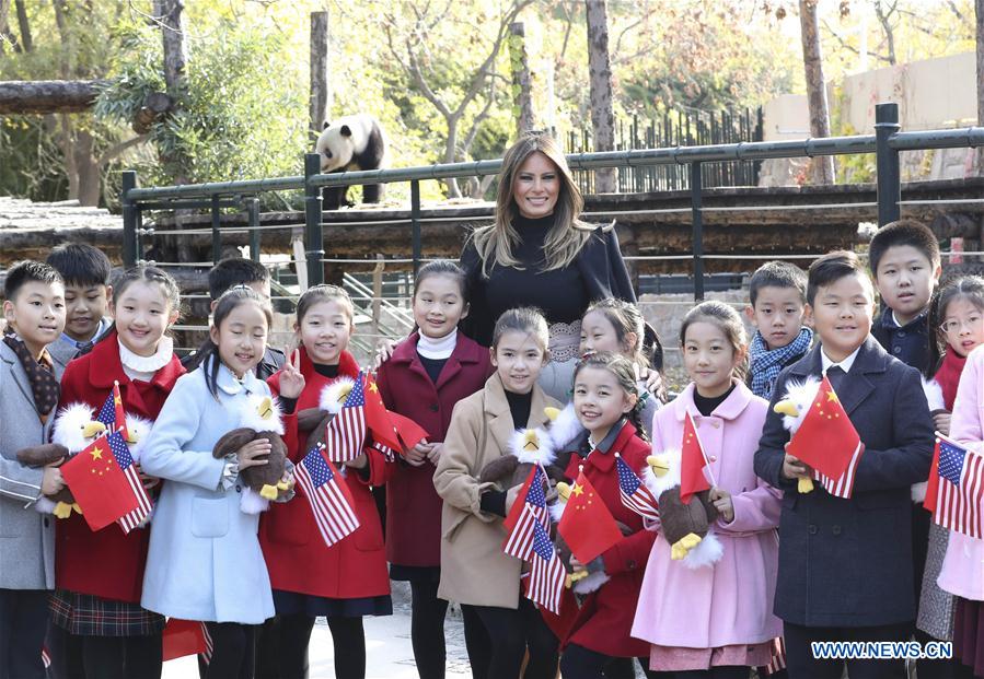 U.S. First Lady Melania Trump poses for a group photo with pupils during her visit to the giant panda enclosure at the Beijing Zoo in Beijing, capital of China, Nov. 10, 2017. (Xinhua/Pang Xinglei)