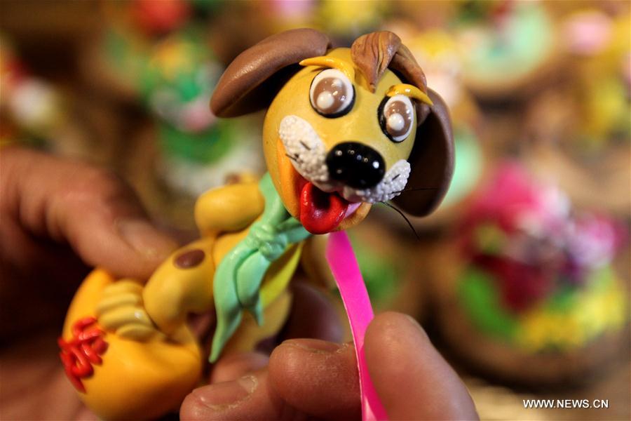 Folk artist Kan Zongqin makes a dog-shaped dough modelling in Shizhong District of Zaozhuang, east China's Shandong Province, Dec. 24, 2017. Kan made dough modellings of 12 zodiac animals to greet the upcoming Chinese lunar new year, which falls on Feb. 16, 2018. (Xinhua/Sun Zhongzhe)