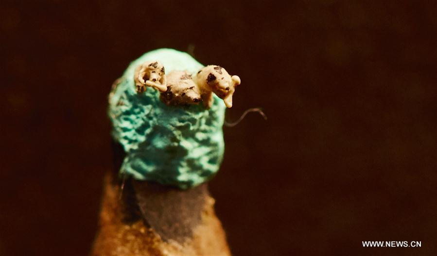 Photo taken on Dec. 18, 2017 shows the miniature dogs sculpture in Taipei, southeast China's Taiwan. Chen Forng Shean, a sculpture artist in Taiwan, made the miniature sculpture with resin material. Chen made the sculpture to greet the Year of the Dog. (Xinhua/Zhao Yingquan)