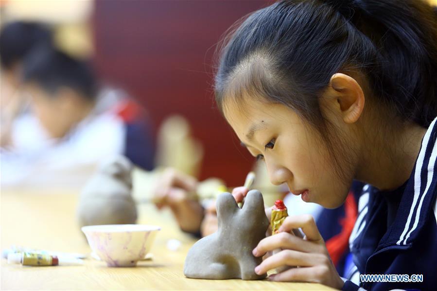 A girl learns to make clay sculpture at Puyu School in north China's Tianjin Municipality, Jan. 3, 2018. Intangible cultural heritage lessons, such as Yangliuqing new year painting, paper cutting and traditional drum performance, were introduced into the school. (Xinhua/Liu Dongyue)