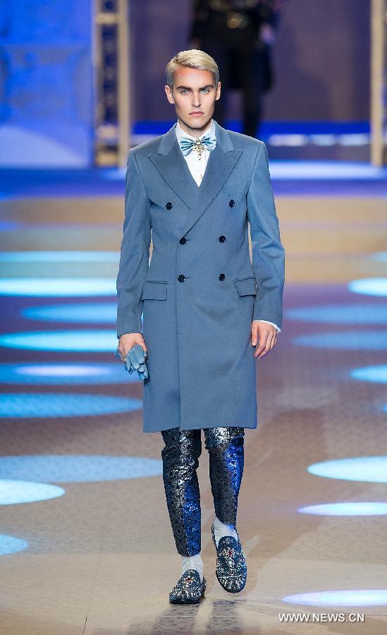 A model presents creations for fashion house Dolce&Gabbana during Milan Men's Fashion Week Fall/Winter 2018/19 in Milan, Italy, Jan. 13, 2018.(Xinhua/Jin Yu)