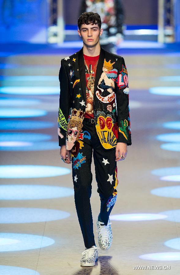 A model presents creations for fashion house Dolce&Gabbana during Milan Men's Fashion Week Fall/Winter 2018/19 in Milan, Italy, Jan. 13, 2018.(Xinhua/Jin Yu)