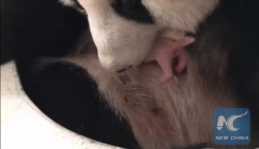Picture grabbed from a video provided by Zoo Negara (national zoo) on Jan. 17, 2018 shows female giant panda Liang Liang and her baby giant panda at Zoo Negara near Kuala Lumpur, Malaysia. (Xinhua/Zoo Negara)
