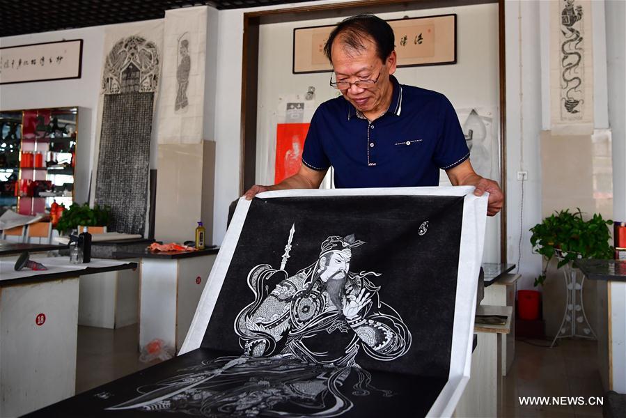 Pei Jianping makes a piece of rubbing artwork in Fudian township of Yanshi, Luoyang City, central China's Henan Province, Aug. 23, 2017. Pei is recognized in 2012 as the Luoyang City's inheritor of rubbing skills, an intangible cultural heritage. (Xinhua/Feng Dapeng)