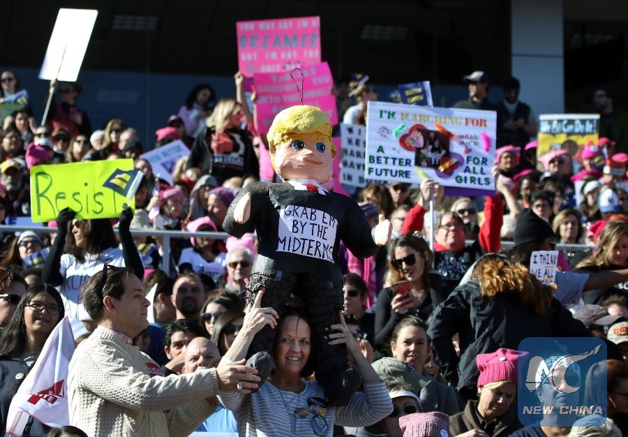 Participants, one with a U.S. President Donald Trump figure, stand strong and applaud with their signs during the Women's March Anniversary "Power To The Polls" event, January 21, 2018 at Sam Boyd Stadium in Las Vegas, Nevada. The rally is aimed at starting a national campaign to register voters, increase support for women and secure progressive seats in the upcoming midterm elections. (Xinhua/ AFP PHOTO)