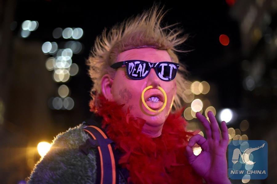 A protester wearing a Donald Trump mask demonstrates during a "Queer Rage" dance party outside the location of the 2017 "Congressof Tomorrow" Joint Republican Issues Conference in Philadelphia, Pennsylvania, U.S. January 25, 2017. (Xinhua/REUTERS)