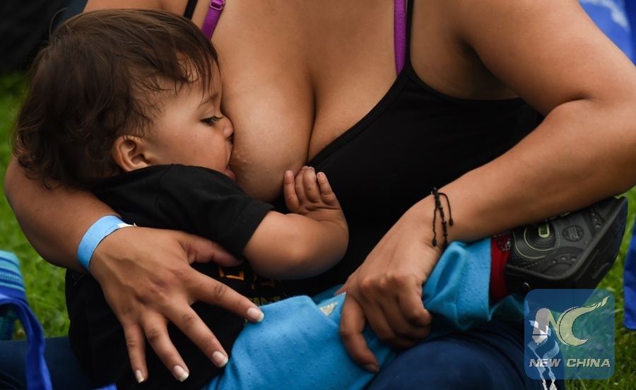 A woman breastfeeds her baby, during a public event to promote the benefits of breastfeeding, at a park in Bogota on November 3, 2017. (Xinhua/AFP PHOTO)