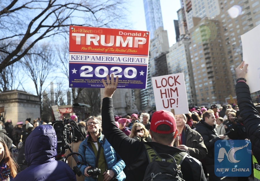 A supporter of U.S. President Donald Trump attends the 2018 Women's March in New York, the United States, Jan. 20, 2018. (Xinhua/Wang Ying)