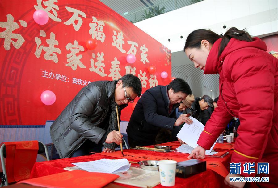 Calligraphers volunteer to write Spring Festival couplets for passengers at Anqing Railway Station, east China’s Anhui Province, Feb. 1, 2018. (Xinhua/Jiang Sheng)