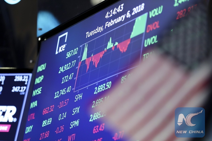 An electronic screen displaying trading data is seen at the New York Stock Exchange in New York, the United States, Feb. 6, 2018. (Xinhua/Wang Ying)