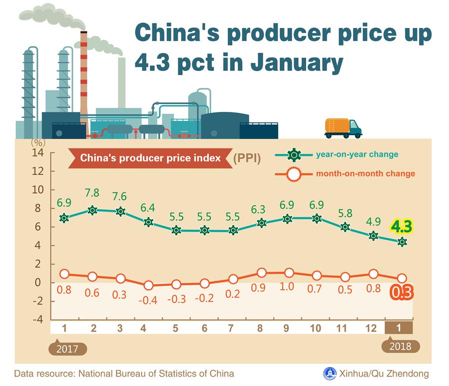 Graphics shows that China's producer price index (PPI), which measures costs for goods at the factory gate, rose 4.3 percent year on year in January. (Xinhua/Qu Zhendong)