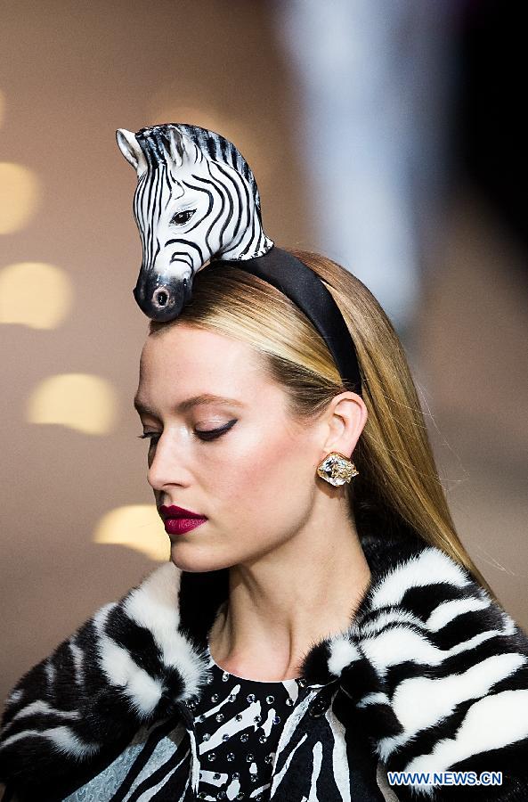A model presents a creation of Dolce&Gabbana "Fashion Devotion" Autumn/Winter?18/19 women's collection during Milan Fashion Week in Milan, Italy, Feb. 25, 2018. (Xinhua/Jin Yu)