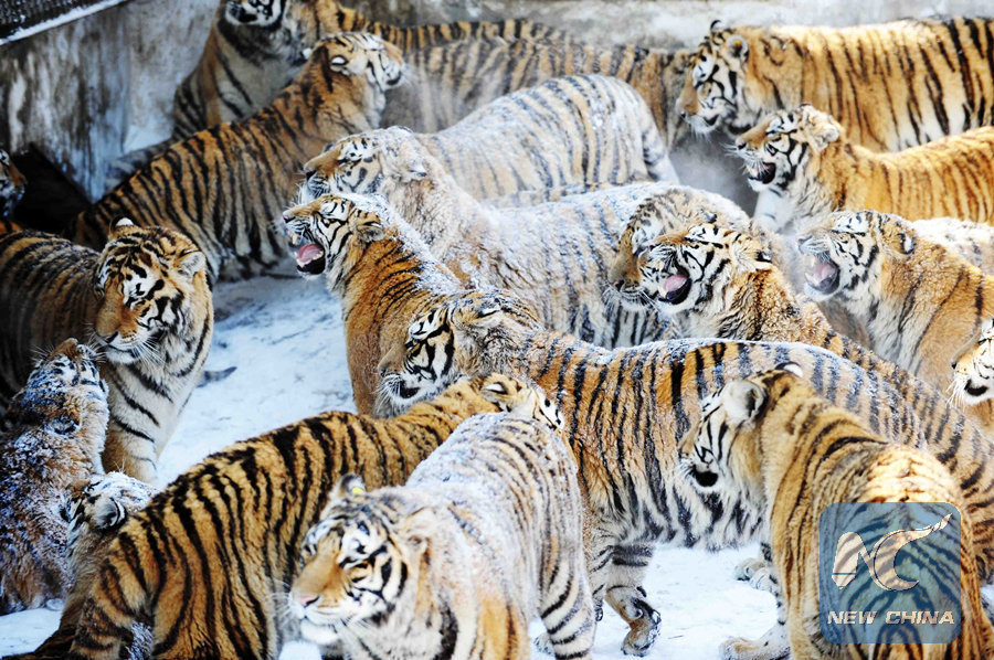 Two Siberian tigers frolic at the Siberian Tiger Park in Harbin, capital of northeast China's Heilongjiang Province, Nov. 19, 2012. (Xinhua/Wang Jianwei)