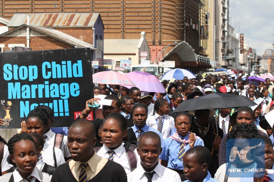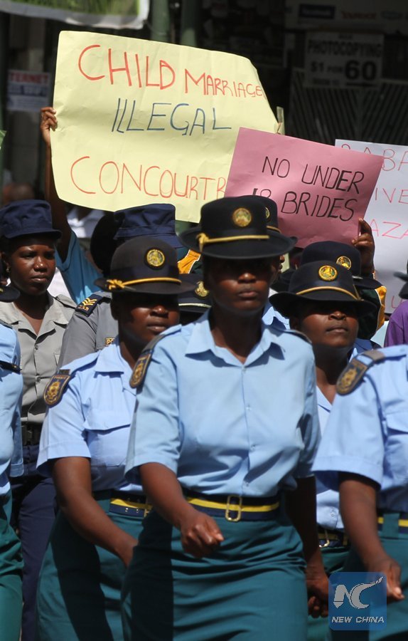 Hundreds of Zimbabwean, mainly women and girls, march in the streets to support a recent high court decision to ban child marriage in downtown Harare, Zimbabwe, Feb. 3, 2016. (Xinhua/Stringer)