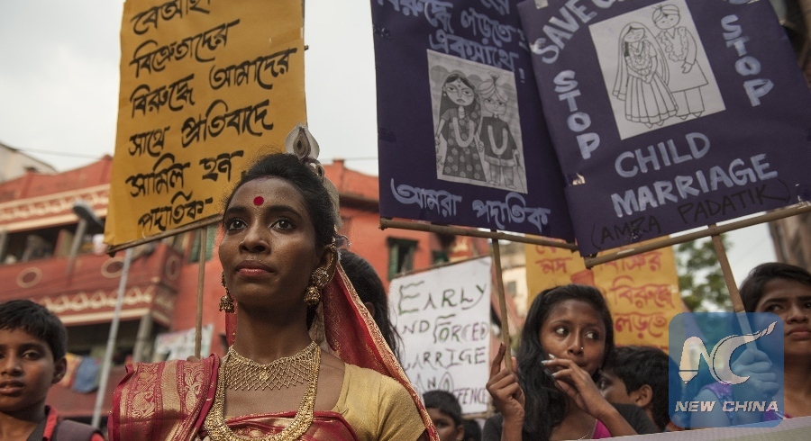 Indian sex workers and their children take part in a rally to raise awareness of child marriage in Kolkata, capital of eastern Indian state West Bengal, Sept. 4, 2015. (Xinhua/Tumpa Mondal)