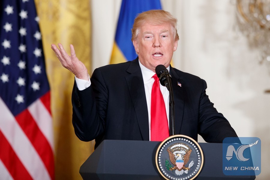 U.S. President Donald Trump addresses a press conference with visiting Swedish Prime Minister Stefan Lofven (not in the photo) at the White House in Washington D.C., the United States, March 6, 2018. (Xinhua/Ting Shen)