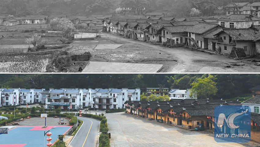 Combined photo shows the Huawu Village before (upper, file photo) and after (lower, taken on Aug. 17, 2017 by Wan Xiang) the renovation work at Yeping township in Ruijin City, east China's Jiangxi Province. Huawu Village, one of poverty-stricken villages in Jiangxi, started renovation and new house building with the help of government in 2013. After 5 years of construction, Huawu villagers moved into new houses early in 2015. (Xinhua)