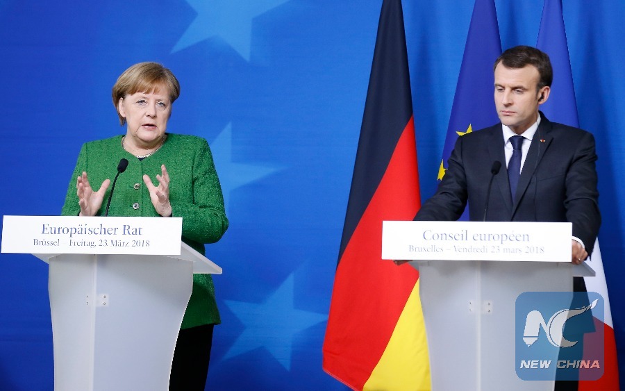Germany's Chancellor Angela Merkel (L) and France's President Emmanuel Macron (R) attend a news conference after the spring EU Summit at EU headquarters in Brussels, Belgium, early on March 23, 2018. (Xinhua/Ye Pingfan)