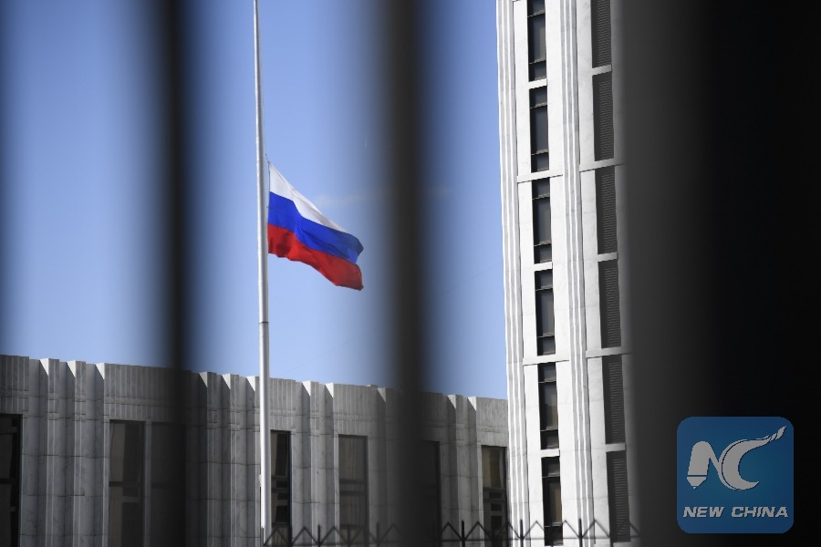 Photo taken on March 26, 2018 shows the Russian national flag at Embassy of Russia in Washington D.C., the United States. U.S. President Donald Trump has ordered the expulsion of 60 Russian diplomats and intelligence officials, and the closure of the Russian Consulate in Seattle in response to the poisoning of a Russian ex-spy in Britain earlier this month. (Xinhua/Yang Chenglin)