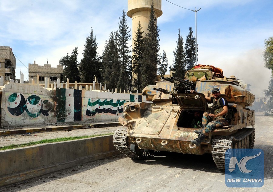 A Syrian tank passes a wall painted with the rebels' flag in the town of Saqba in the capital Damascus' Eastern Ghouta after the army liberated it on March 18, 2018. (Xinhua/Ammar Safarjalani)