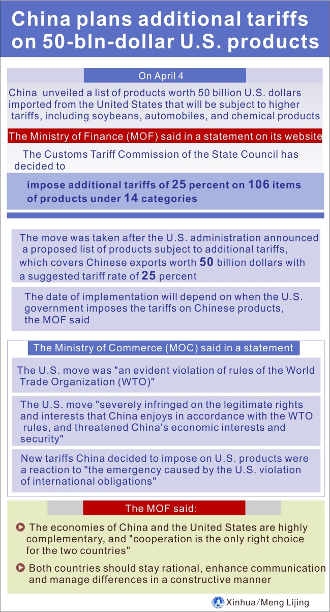 Hours after the U.S. administration announced proposed tariffs on products from China worth some 50 billion U.S. dollars, China unveiled countermeasures on Wednesday targeting the same value of U.S. goods.