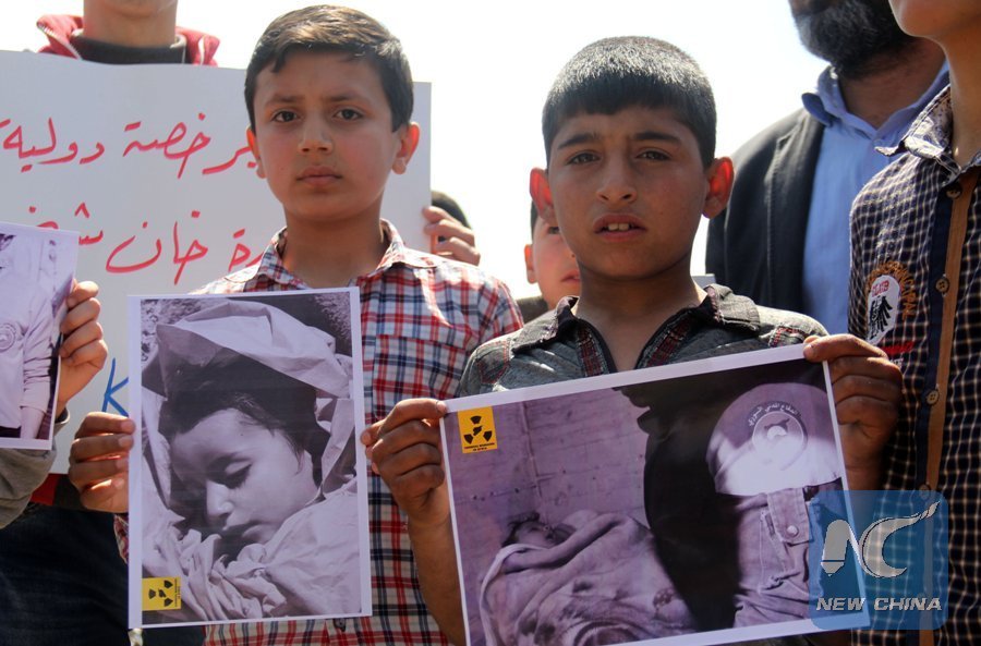In this file photo taken on April 7, 2017, Syrian residents of Khan Sheikhun hold placards and pictures during a protest condemning a suspected chemical weapons attack on their town that killed at least 86 people, among them 30 children. (Xinhua/AFP)