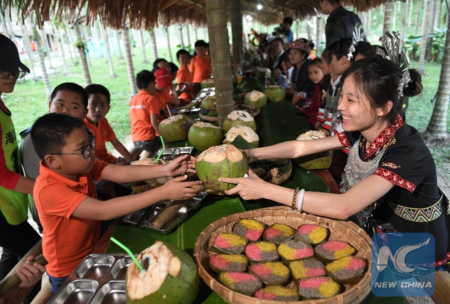 Tourists taste coconut in Xiaomei Village, Lingshui Li Autonomous County, south China's Hainan Province, Jan. 21, 2018. After local government's targeted measures in poverty alleviation work, the improved environment in Xiaomei Village, once an impoverished village, now attract more tourism business for local people. (Xinhua/Zhao Yingquan)