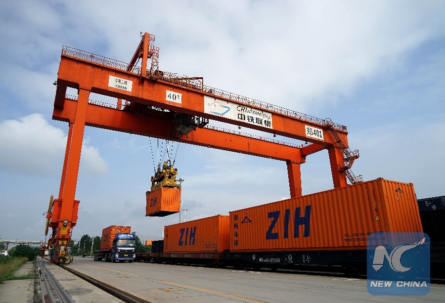 Containers are loaded onto a China-Europe freight train in Zhengzhou City, capital of central China's Henan Province, Aug. 2, 2017. (Xinhua/Li An)