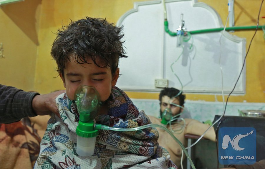 Syrian children and adults receive treatment for a suspected chemical attack at a makeshift clinic on the rebel-held village of al-Shifuniyah in the Eastern Ghouta region on the outskirts of the capital Damascus late on Feb. 25, 2018. (Xinhua/AFP)
