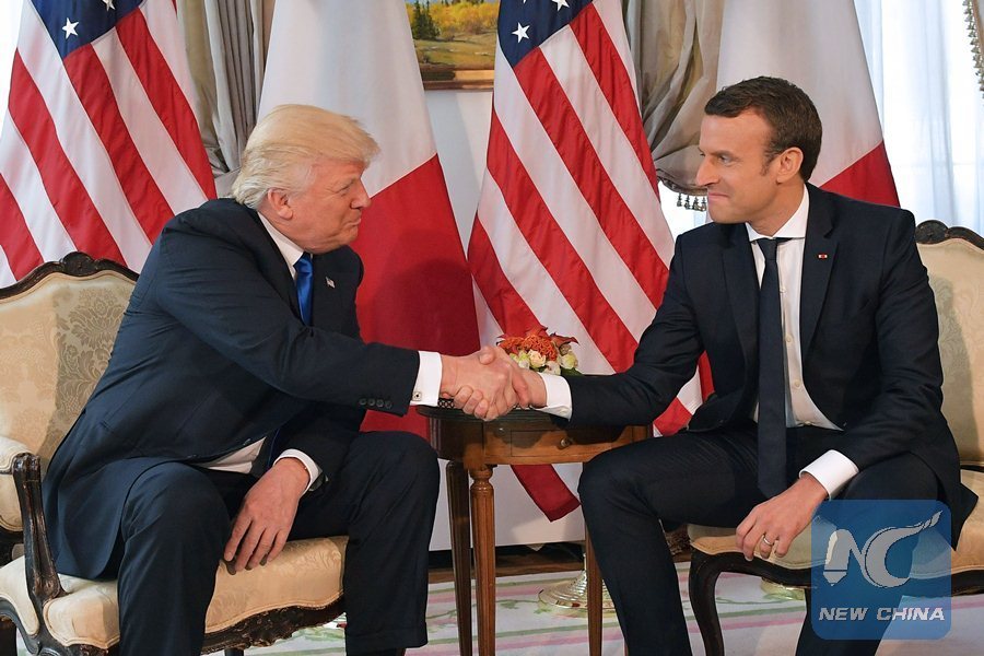 In this file photo taken on May 25, 2017 US President Donald Trump (L) and French President Emmanuel Macron (R) shake hands ahead of a working lunch, at the US ambassador's residence, on the sidelines of the NATO (North Atlantic Treaty Organization) summit, in Brussels. (Xinhua/AFP)