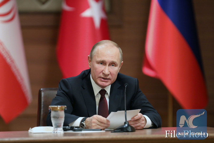 File photo: Russian President Vladimir Putin speaks during a joint press conference with his Turkish and Iranian counterparts after their meeting on Syria issues at the Presidential Palace in Ankara, Turkey, on April 4, 2018. (Xinhua/Mustafa Kaya)