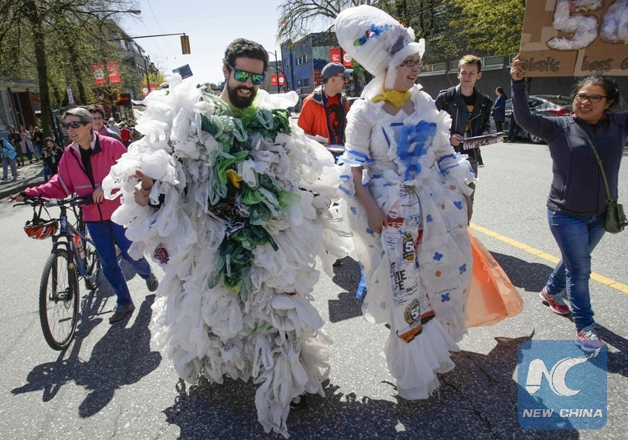File Photo: Participants wearing costumes made with plastic bags are seen during the Earth Day Parade in Vancouver, Canada, on April 21, 2018. (Xinhua/Liang Sen)