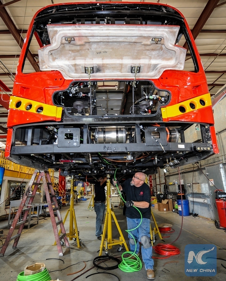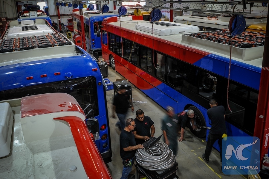 File photo taken on Sept. 23, 2016 shows people working at a BYD electric vehicle plant in Lancaster, California, the United States.(Xinhua/Zhang Chaoqun)