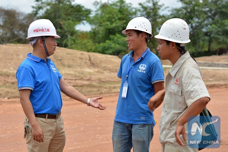 Photo taken on May 2, 2018 shows Xu Zhou (1st L), a project manager of the China Railway No. 2 Group (CREC2), talks with two workers on the China-Laos railway construction site at the suburb of Lao capital Vientiane. (Xinhua/Liu Ailun)