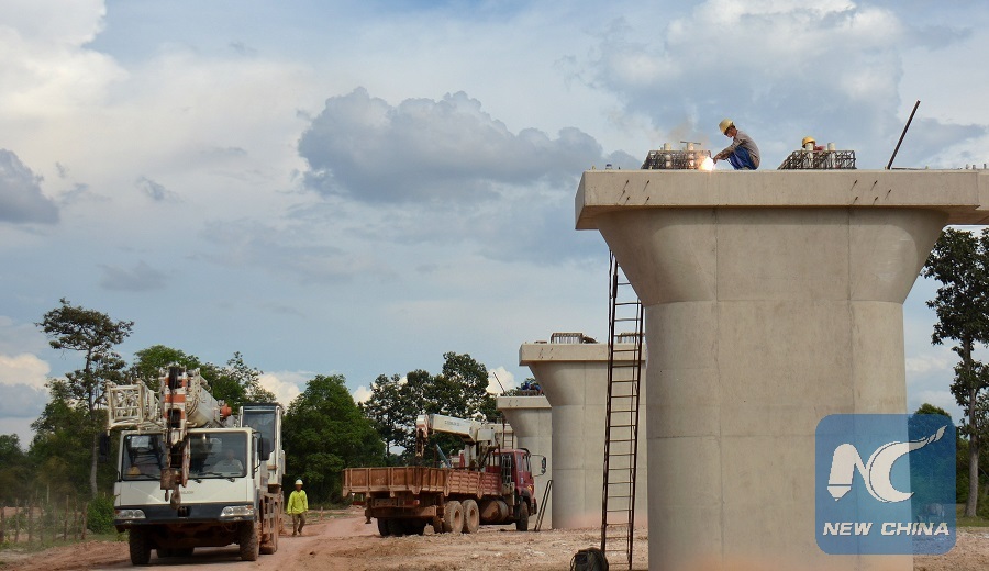 Photo taken on May 2, 2018 shows the Nam Khone super major bridge under construction by China Railway No. 2 Engineering Group Co., Ltd. (CREC2) in Vientiane, capital of Laos. (Xinhua/Liu Ailun)