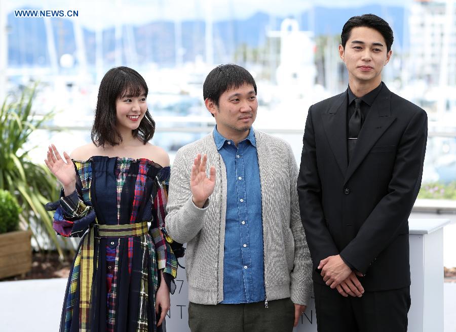 Actress Erika Karata, director Ryusuke Hamaguchi and actor Masahiro Higashide (from L toR) of the film "Asako I & II (Netemo Sametemo)" pose during a photocall at the 71st Cannes International Film Festival in Cannes, France, on May 15, 2018. The 71st Cannes International Film Festival is held from May 8 to May 19. (Xinhua/Luo Huanhuan)