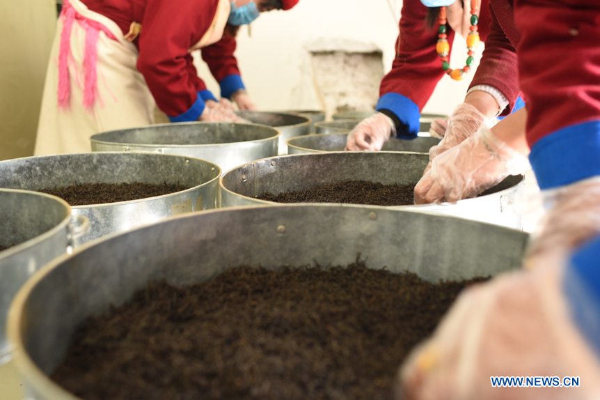 Members of tea farmers and herdsmen professional cooperative process tea leaves in Le Menba Ethnic Township of Cuona County in Shannan, southwest China's Tibet Autonomous Region, May 12, 2018. The tea cooperative was founded in 2011. In 2017, the income per capita of the township increased by about 12,000 yuan under the cooperative. Tea industry has now become one of the most important driving forces of local economy.(Xinhuanet/Chen Lin)