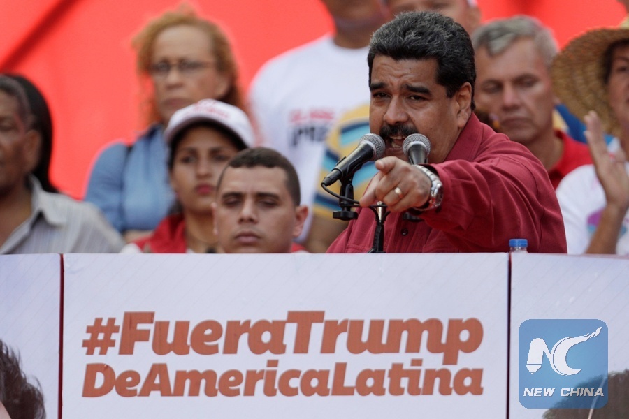 Venezuela's President Nicolas Maduro gives a speech in front of a sign, which reads, "Trump go away from Latin America," at a rally against U.S. President Donald Trump in Caracas, Venezuela, August 14, 2017. (Xinhua/REUTERS)
