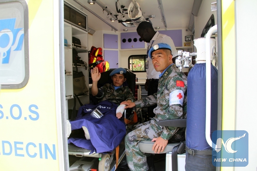Injured Chinese peacekeeper Si Chongchang (L) waves to people as he leaves a hospital in Dakar, Senegal, on June 26, 2016. Four Chinese peacekeepers, injured in terrorist attacks in Mali, left for China on Sunday. (Xinhua/Wang Meng)