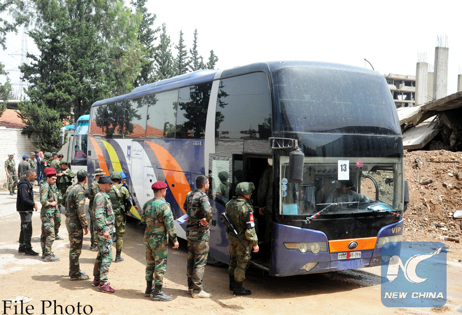 Syrian and Russian soldiers stand beside a bus transporting rebels and their families on the outskirts of the Beit Sahm, southeast of Damascus, Syria, on May 7, 2018. (Xinhua/Ammar Safarjalani)