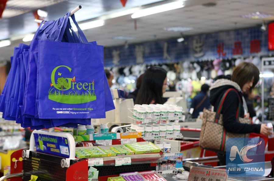 File photo taken on April 16, 2008 shows environmental-friendly shopping bags in a supermarket in Shanghai, east China. (Xinhua/Liu Ying) (zwx)